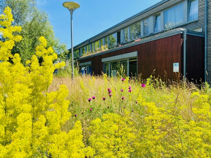 Ein naturnah gestaltetes Außengelände dient als „Grüner Seminarraum“ und Pausenort für die Mitarbeitenden. In Hochbeeten wachsen Gemüsepflanzen und Kräuter, verschiedene Obstbäume spenden Schatten. Rund um das Gebäude sind exemplarisch verschiedene Nisthilfen und Fledermauskästen mit Info-Schildern angebracht.