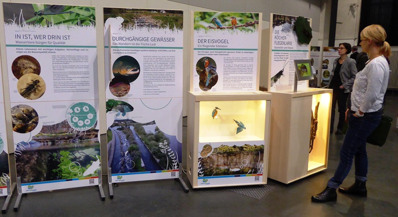 Im Hauptteil der Ausstellung geht es um die einzigartige Vielfalt unserer Bäche und Flüsse, ihre Bedeutung und die Folgen von Eingriffen. Anhand ausgewählter Tiere wie Biber, Eisvogel, Lachs und Köcherfliege wird veranschaulicht, was ökologisch intakte Fließgewässer kennzeichnet. Es wird gezeigt, wie sich Eingriffe auswirken, warum Gewässerschutz wichtig ist und was für eine ökologische Verbesserung getan werden muss.