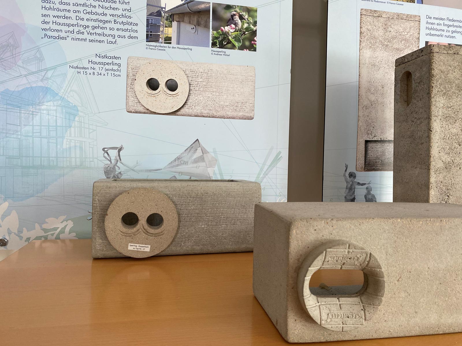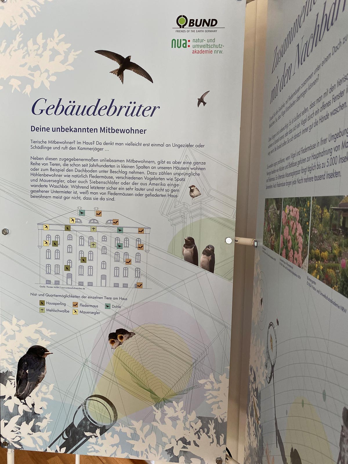 Die Ausstellung „Mehr Platz für Spatz & Co“ vom BUND Landesverband NRW, die gemeinsam mit der NUA und der Biologischen Station Hagen konzipiert wurde, stellt einige der gebäudebrütenden Tierarten mit ihrer Biologie vor und klärt über ihre Gefährdungen auf. Sie informiert über Möglichkeiten für Schutzmaßnahmen in Gebäuden und bietet konkrete Unterstützung bei der Umsetzung bis hin zu Adressen für den Kauf von Nistkästen. Einige Kästen für die Integration in das Wärmeverbundsystem sind als Anschauungsobjekte in der Ausstellung enthalten. Darüber hinaus gibt die Ausstellung Tipps für die tierfreundliche Gestaltung des Wohnumfeldes. Die Finanzierung der Ausstellung erfolgte mit Unterstützung der Stiftung Umwelt und Entwicklung Nordrhein-Westfalen (SUE).